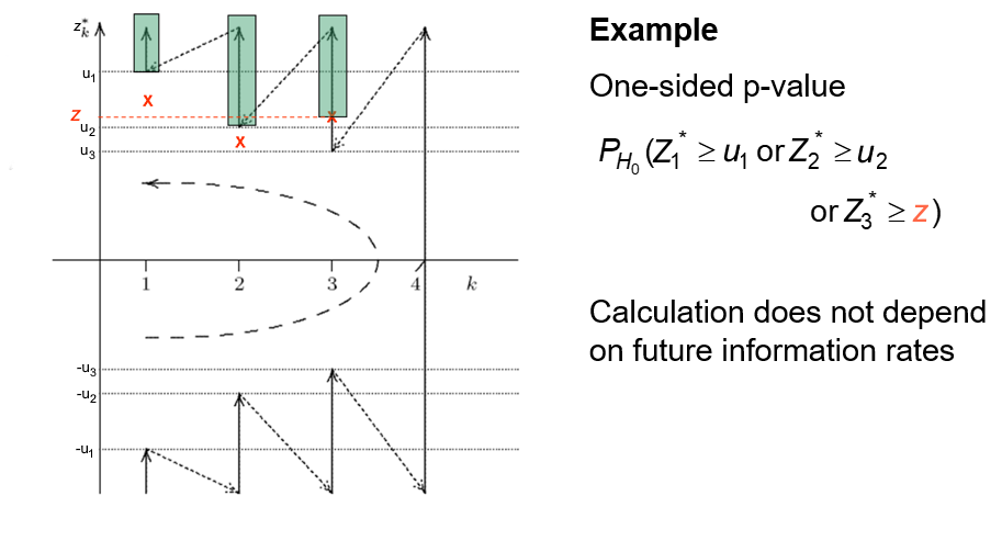 In a group sequential design, define overall \(p\)-value at the end of the trial through